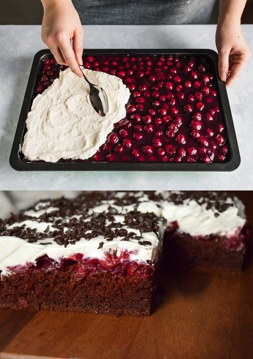 Ten Schwarzwaldzki placek piecze się na blaszce i łączy delikatne kakaowe ciasto z orzeźwiającymi wiśniami i puszystą śmietanką. To idealny deser dla wszystkich miłośników czekolady.